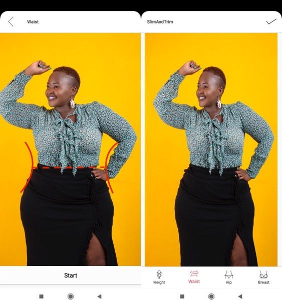 Dopo aver scaricato Make Me Slim sul tuo dispositivo, avvia l’app e, nella sua schermata iniziale, pigia sul bottone Shape per modificare un’immagine salvata sul tuo dispositivo oppure sul pulsante Camera, per scattare una foto al momento. Dopo aver concesso all’app i permessi necessari e aver scelto o scattato la foto che vuoi ritoccare, premi sulle voci Height, Waist, Hip e/o Breast poste nella parte inferiore dello schermo e pigia sul bottone Start (in basso), per regolare, rispettivamente, altezza, vita, fianchi e/o petto del soggetto presente nella foto.