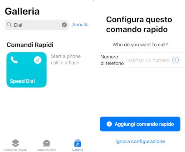 Un’altra possibilità consiste nell’attivazione di un comando rapido: fra le soluzioni disponibili nell’omonima applicazione (accessibile premendo l’icona con il simbolo dei due rombi colorati che si intersecano e sfiorando la funzione Galleria posta in basso a destra nel menu principale), può tornare utile quella denominata Speed Dial. Puoi facilmente individuarla eseguendo una ricerca tramite il campo ivi presente, oppure puoi collegarti direttamente a questa pagina.