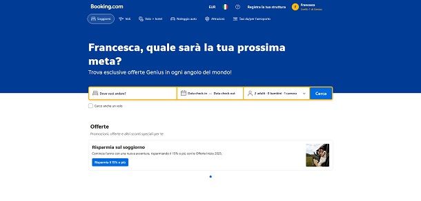 Ora che possiedi un account, puoi accedere a tutte le funzionalità del servizio. Andiamo quindi a vedere subito la cosa principale, ossia prenotare un alloggio per il tuo prossimo viaggio. Innanzitutto dovrai digitare la tua destinazione nel riquadro Dove vuoi andare?, dopodiché fai clic sull'icona del calendario e seleziona la data di arrivo e quella di partenza. Come ultimo passaggio inserisci il numero di ospiti, premendo sull'icona del + o sull'icona del – per, rispettivamente, aggiungere o rimuovere persone e infine pigia sulla voce Cerca.