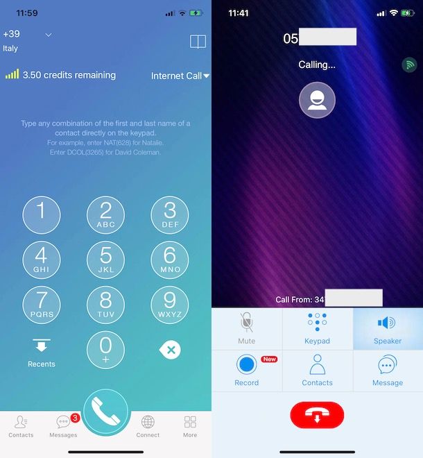 Dopo aver guadagnato o crediti, puoi effettuare la tua prima chiamata. Fai tap sulla voce Call presente nel menu in basso, seleziona il prefisso del paese che intendi chiamare pigiando sull’icona della freccia rivolta verso il basso (in alto a sinistra) e componi il numero tramite il tastierino, dopodiché fai tap sull’icona della cornetta e pigia sulla voce Cheap call per avviare la chiamata.
