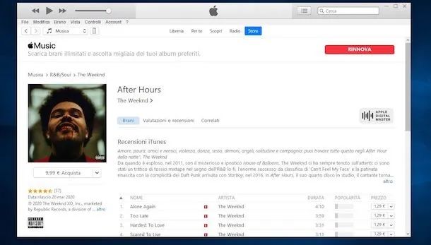 A questo punto sei pronto per iniziare ad acquistare su iTunes i contenuti di tuo interesse. Seleziona, quindi, una delle opzioni disponibili tra Podcast e Audiolibri tramite il menu a tendina collocato in alto a sinistra e, nella nuova schermata visualizzata, seleziona la voce Store. Per quanto riguarda la musica o i film, invece, digita “musica” oppure l’artista, il brano o il titolo del film che desideri acquistare nella barra di ricerca in alto a destra, così verrai ricondotto a una schermata utile per completare l’acquisto, pur non essendoci più la possibilità di riprodurre i contenuti tramite iTunes (ma solo mediante Apple Music e Apple TV).