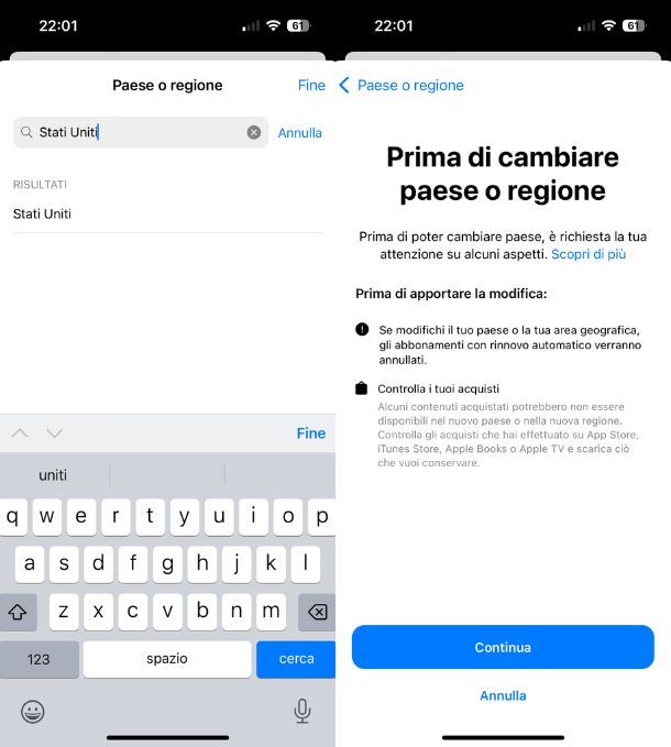 Adesso, seleziona l’opzione Stati Uniti e premi prima sul pulsante Continua, poi sulla voce Accetto, per accettare i termini e le condizioni dei servizi Apple e cambiare il Paese associato al tuo ID Apple.