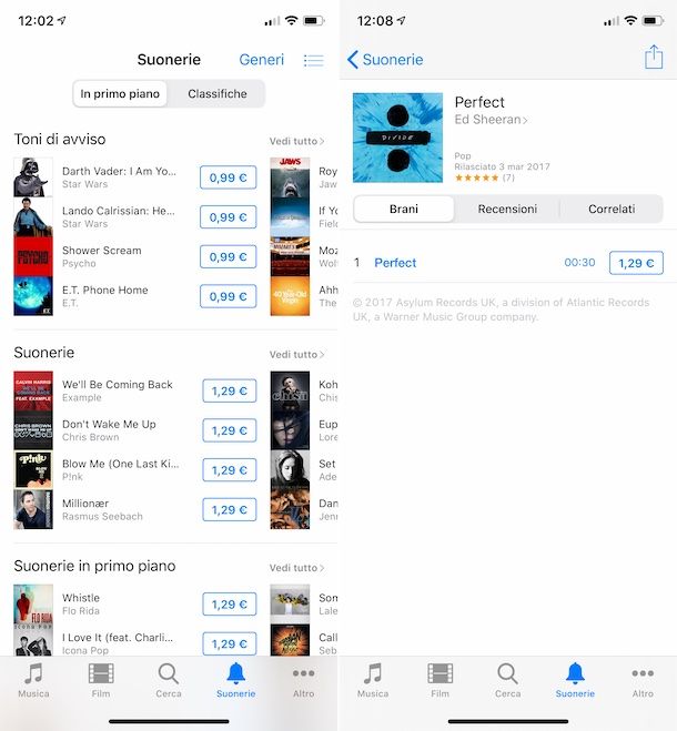 A questo punto, sei pronto per acquistare su iTunes Store. Per farlo, avvia l’app iTunes Store facendo tap sulla sua icona (la stella bianca su sfondo viola) e accedi alla sezione di tuo interesse tra Musica e Suonerie. A prescindere dalla tua scelta, nella nuova schermata visualizzata, seleziona l’opzione In primo piano, per visualizzare i contenuti del momento, o la voce Classifiche, per visualizzare la lista di album, canzoni e suonerie più acquistate su iTunes Store.