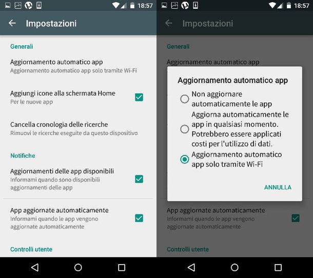 Se vuoi essere sicuro che Google Chrome sia sempre aggiornato all’ultima versione, puoi anche attivare la funzionalità di aggiornamento automatico delle app per il Play Store: avvia il Play Store, premi sulla tua foto profilo in alto e seleziona la voce Impostazioni dal meni proposto. Premi poi sulla dicitura Preferenze di rete, su quella Aggiornamento automatico app e scegli se vuoi aggiornare le app di solo su rete Wi-Fi o su qualsiasi rete (inclusa quella dati della SIM).