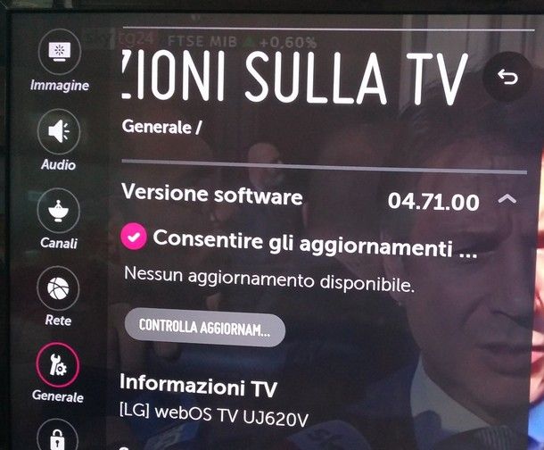 All'interno di questo menu, scegli la sezione Generali e in seguito la voce Informazioni sulla TV. Successivamente, pigia sul pulsante Controlla aggiornamenti per avviare la ricerca di nuovi aggiornamenti per il modello di TV in tuo possesso.