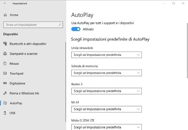 Se, invece, desideri disattivare AutoPlay per tutti i dispositivi che verranno collegati al computer (chiavette USB, supporti ottici, smartphone, fotocamere e così via), conosciuti e non, devi semplicemente spostare su Disattivato l’interruttore collocato subito sotto la voce Usa AutoPlay per tutti i supporti e i dispositivi.
