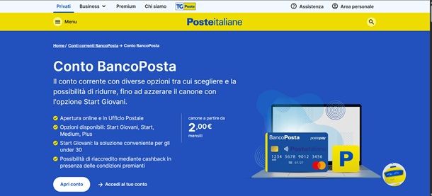 - Start Giovani — questa è la soluzione ideale per gli under 30 che, al costo di 2 euro al mese offre un conto monointestato con una carta di debito Postepay, un carnet di assegni, prelievi da ATM Postamat, Internet e mobile banking e altro ancora.