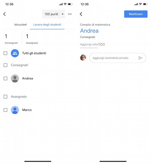 A questo punto, premi sul nome di un singolo studente, per visualizzare il compito consegnato, e inserisci la tua eventuale correzione nel campo Commento privato in basso. Inserisci, poi, il voto nel campo visibile in prossimità della voce Voto e fai tap sul pulsante Restituisci, in basso a destra e poi ancora su Restituisci per restituire il compito allo studente.
