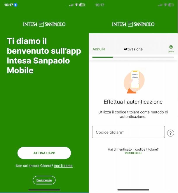 Per procedere, avvia dunque l’app di Intesa Sanpaolo facendo tap sulla sua icona (un quadrato bianco su sfondo verde), premi sul pulsante Attiva l’app e, nella schermata Effettua l’autenticazione, inserisci il tuo codice cliente (quello che ti è stato fornito al momento dell’apertura del conto) nel campo Codice titolare.