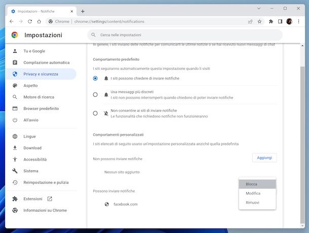 Tra le altre cose, Chrome permette di bloccare del tutto le richieste di invio di notifiche da parte dei siti Web: tutto ciò che devi fare è selezionare l'opzione Non consentire ai siti di inviare notifiche che trovi nella sezione Comportamento predefinito nella schermata di cui sopra.