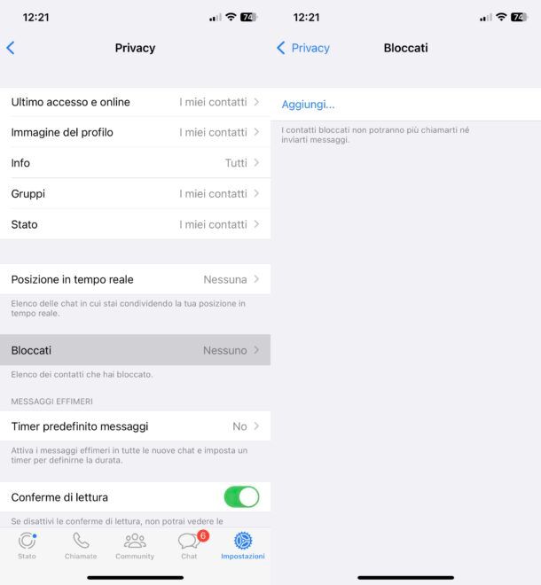 - Da iPhone — accedi a WhatsApp dalla sua app ufficiale, recati nella sezione Impostazioni > Privacy > Bloccati, fai tap sul pulsante Aggiungi… e scegli il contatto da bloccare.