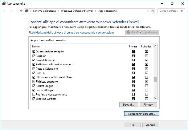 Fatto ciò, identifica il programma per cui intendi riattivare i permessi d'accesso dalla lista proposta, apponi il segno di spunta in corrispondenza della casella Privata e/o Pubblica a seconda della tipologia di rete in cui agire e, infine, conferma le modifiche cliccando sul pulsante OK.