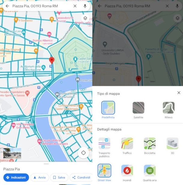 In tal modo, verrà mostrato nell'angolo in basso a sinistra della mappa il riquadro di Street View: ti basterà sfiorarlo per accedere alla visualizzazione in tale modalità. Se non riscontri la presenza della funzionalità in questione, prova a pigiare sul simbolo dei due rombi sovrapposti collocato in alto a destra e, nel pannello che compare, seleziona la funzione Street View all'interno della sezione Dettagli mappa, utile per rendersi conto se il luogo prescelto rientra nell'area coperta dalle rilevazioni dei veicoli di Google.