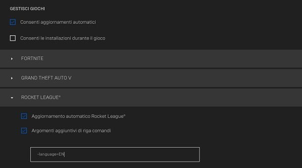 A questo punto, fai clic sulla voce ROCKET LEAGUE, in modo da espandere le opzioni disponibili, e spunta la casella Argomenti aggiuntivi di riga comandi. Questa funzionalità è pensata per “forzare” dall’esterno alcune impostazioni di gioco, senza dover nemmeno mettere le mani in modo “classico” sui file relativi ad esso.