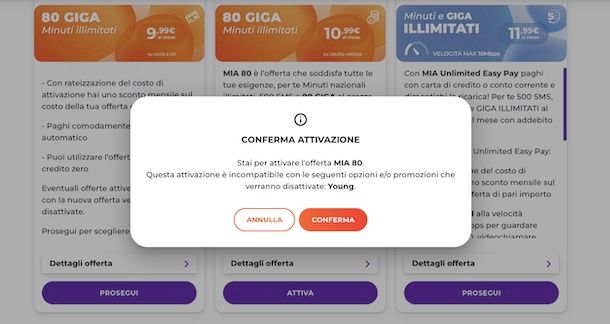 Quando trovi quella che fa al caso tuo, premi sul tasto Prosegui/Attiva, se richiesto inserisci il metodo di pagamento tra Carta di credito o Addebito su C/C, premi sul tasto Continua e segui gli step successivi, quindi conferma la tua intenzione premendo sul tasto Conferma.