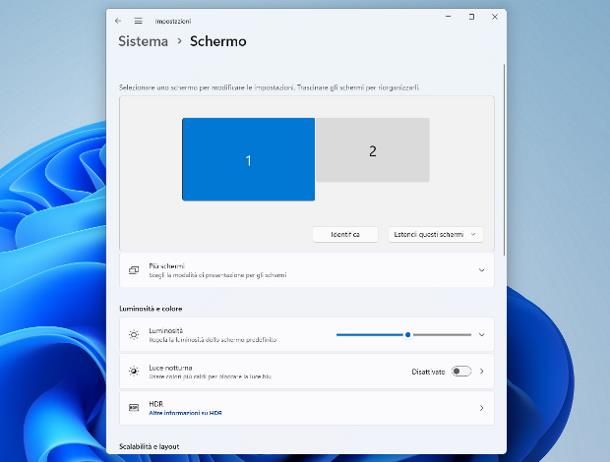 Per modificare la risoluzione dell’uno o dell’altro display, ridisporre la posizione degli schermi oppure cambiarne l’orientamento, fai clic destro su un punto vuoto del desktop, seleziona la voce Impostazioni schermo dal menu che ti viene proposto e seleziona l’icona dello schermo sul quale agire. Il gioco è praticamente fatto: per regolare il comportamento del monitor selezionato, non devi fare altro che accedere alle sezioni Più schermi, Luminosità e colore o Scalabilità e layout, per applicare le impostazioni che desideri.