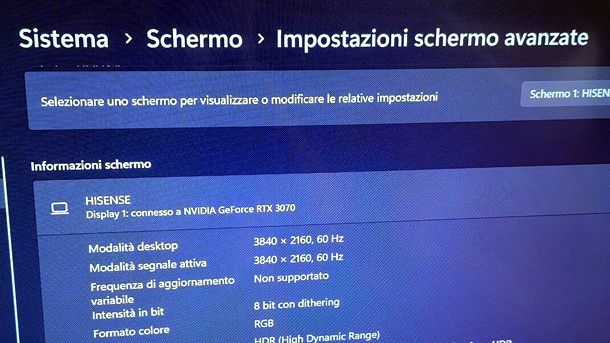 Quest’ultima voce, in particolare, risulta importante su un televisore, in quanto la diagonale più ampia e la risoluzione più elevata potrebbero mostrare, ad esempio, delle icone di Windows troppo piccole. Valuta bene, insomma, le opzioni a tua disposizione per migliorare la visualizzazione in questo contesto. Se vuoi un consiglio a tal proposito, approfondisci anche l’area Impostazioni schermo avanzate, in quanto quest’ultima mette in evidenza tutti i dettagli del televisore coinvolto e mette a disposizione l’opzione Scegli una frequenza di aggiornamento, che può tornarti utile impostare anche in ottica gaming.