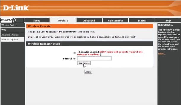 Successivamente, apri l’area di gestione del router così come ti ho spiegato poco fa, premi sulla voce Wireless (in alto) e poi sulla dicitura Wireless Repeater (di lato); ora, apponi il segno di spunta accanto alla casella denominata Repeater Enabled, premi sul pulsante Site Survey e rispondi in maniera affermativa all’avviso che ti viene mostrato, per visualizzare l’elenco delle reti wireless rilevate nelle vicinanze.