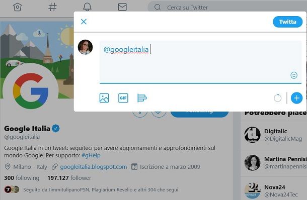 A questo punto, trova il profilo Google Italia e, per poter entrare in contatto con il servizio di assistenza offerto da quest’ultimo, premi sul pulsante Twitta. Dopodiché, nel campo di testo che ti viene mostrato, scrivi un tweet utilizzando l’hashtag #gHelp per aiutare il team a individuare il messaggio da te pubblicato.