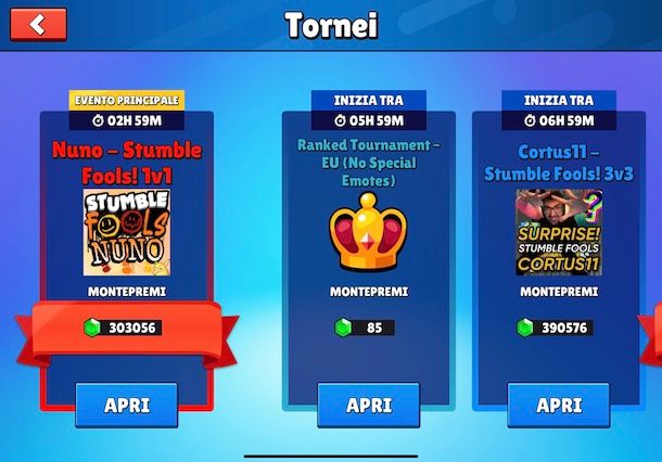 Chiunque può partecipare a un torneo pubblico premendo sulla voce Tornei disponibile nella schermata principale del gioco, selezionando l'opzione Apri relativa al torneo di proprio interesse e premendo sul pulsante Iscrizione. Tieni presente che solitamente è prevista una quota d'ingresso che comporta l'utilizzo di gemme e una ricompensa, sempre in gemme, per il vincitore.