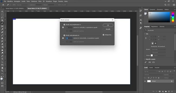 Una volta ottenuto il tuo foglio bianco è tempo di dividerlo, quindi devi cercare nella colonna di sinistra lo strumento Sezione. Lo puoi incontrare facendo clic destro sullo strumento Taglierina, scorrendo poi appena sotto e cliccando sulla voce Sezione. A questo punto fai clic destro sul foglio e seleziona la voce Dividi sezione.