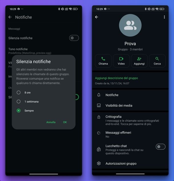 Puoi agire anche dalla conversazione, cliccando sul nome del gruppo in alto, poi su No in corrispondenza della voce Silenzia e infine selezionando tra 8 ore, 1 settimana o Sempre. Pigia sul pulsante Fatto in basso a destra per confermare.