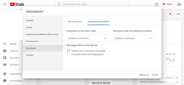Se poi preferisci una soluzione meno drastica, agendo dalla sezione Community puoi scegliere di lasciare attivati i commenti e impostare delle limitazioni per i messaggi pubblicati, compresa la nomina di moderatori che avranno il compito di gestire i commenti del tuo canale YouTube. Per avere maggiori info in merito, ti lascio alle mie guide su come bannare su YouTube e come fare il moderatore su YouTube.