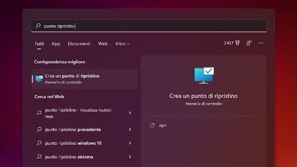 Per accedere all’utility di ripristino di configurazione di sistema, premi sul pulsante Start (l’icona della bandierina di Windows), cerca i termini punto ripristino nel menu che compare a schermo e seleziona il primo risultato della ricerca (che dovrebbe essere Crea un punto di ripristino).