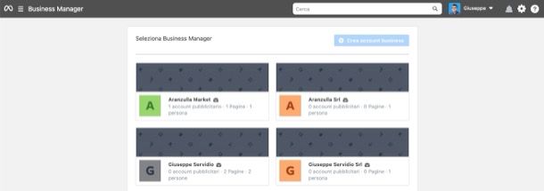 Per procedere, clicca su questa pagina di Business Manager e accedi al tuo account Facebook (se non l'hai ancora fatto), così da recarti nelle impostazioni business di quest'ultimo. Successivamente, fai clic sull'account su cui effettivamente intendi agire, apri il menu situato sotto la dicitura Home (in alto a sinistra) e fai clic sull'icona raffigurante l'ingranaggio posta in corrispondenza dell'account pubblicitario su cui intendi agire.