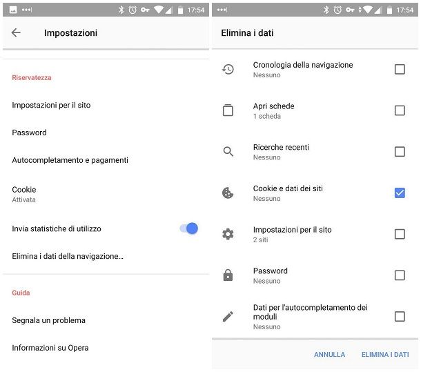 Su Android, avvia l'app di Opera e premi sull'icona dell'omino che trovi in basso a destra. Fatto ciò, nel riquadro che visualizzi, premi sull'icona dell'ingranaggio in alto e, nella nuova sezione, scorri la schermata fino a individuare la voce Riservatezza & Sicurezza. Adesso, premi sulla voce Elimina i dati, metti un segno di spunta solo sulla casella Cookie e dati dei siti e poi conferma l'operazione tramite il tasto in basso Elimina i dati.