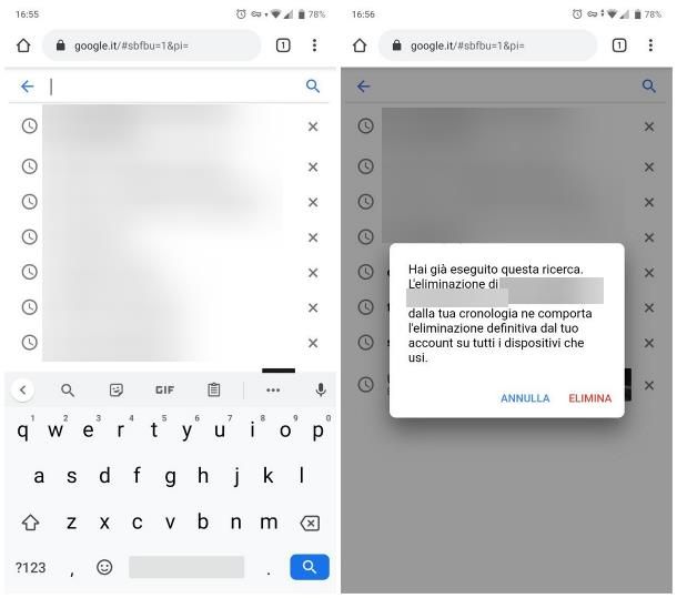 Una volta compiuti i passaggi di cui sopra, premi sulla barra di ricerca situata al centro della pagina per prendere visione delle ultime ricerche eseguite. Quando trovi la ricerca che vuoi cancellare, premi sul pulsante (x) in sua corrispondenza e conferma la tua volontà sfiorando il tasto Elimina.