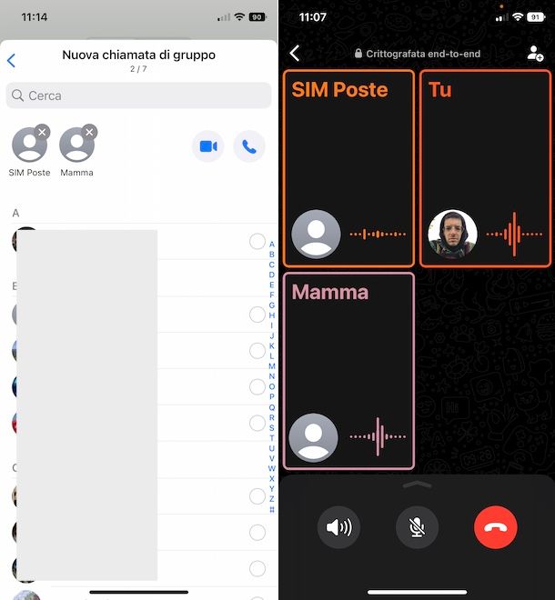 Per procedere, avvia dunque WhatsApp, accedi alla sezione Chiamate, fai tap sull’icona della cornetta e seleziona l’opzione Nuova chiamata di gruppo. Nella nuova schermata visualizzata, apponi il segno di spunta accanto alle due persone che intendi includere nella chiamata, fai tap sull’icona della cornetta e attendi la risposta di ciascun contatto chiamato.