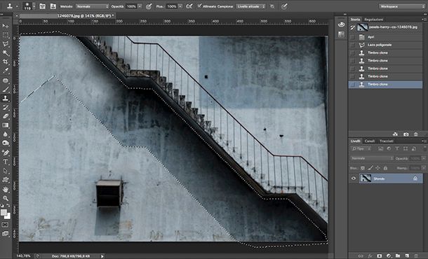 Se lo sfondo è irregolare, dovrai prestare attenzione al risultato finale, in modo tale che sia privo di evidenti aberrazioni e stacchi. Per eliminare questi ultimi, puoi servirti dello strumento Toppa, funzionale anche per togliere le ombre direttamente, quando lo sfondo è monocromatico. Si usa semplicemente selezionando con il mouse l'area da modificare e spostando la selezione in una zona migliore.