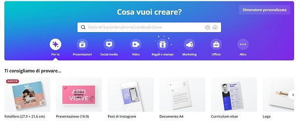 Dalla Home, puoi scegliere di creare un nuovo file tramite il pulsante Crea un progetto, oppure usare uno dei tanti modelli eseguendo una ricerca tramite la barra in alto. Una volta individuato quello più opportuno, cliccaci sopra seguito dalla voce Personalizza questo modello e accederai così alla sezione di editing.