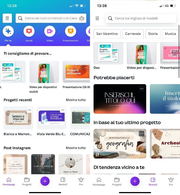 Conclusa l'operazione di registrazione, puoi utilizzare Canva mediante il tuo account e a titolo gratuito. Come ti dicevo, infatti, i servizi offerti da Canva sono liberamente accessibili. Canva, tuttavia, dispone di una versione Pro a 11,99 euro/mese che permette di ottenere diverse funzionalità aggiuntive, un'ampia scelta di template riservati ai clienti Pro e molto altro, usufruendo anche di un periodo di prova gratuito. Maggiori info qui.