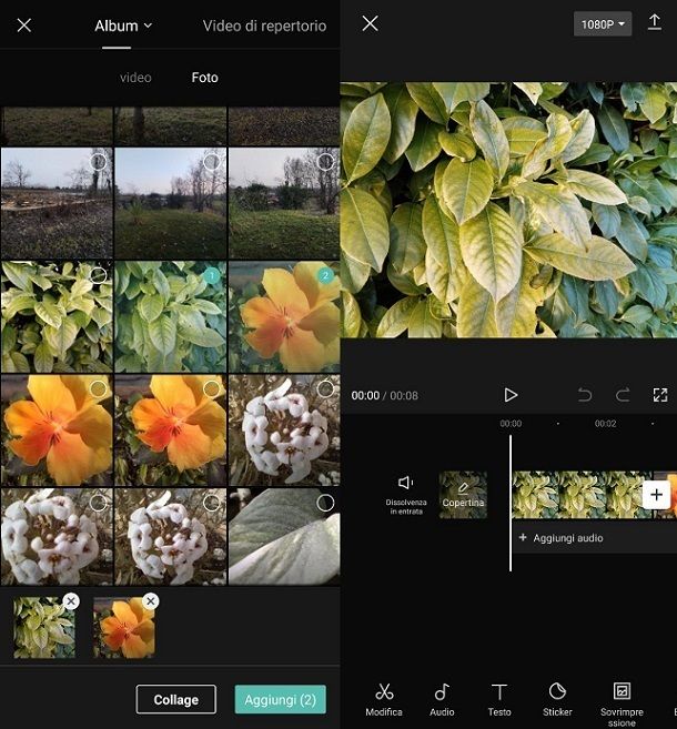 Per intenderci, si tratta di un’app per editare video collegata a TikTok, dato che, oltre a permettere di pubblicare il risultato finale in pochi tap in quest’ultimo social network, può anche consentirti di attingere dall’ampio catalogo musicale di TikTok. Fatta questa dovuta premessa, al primo avvio di CapCut ti basterà premere sul riquadro Nuovo progetto, in modo da poterti poi spostare nella scheda Foto, selezionando i file da importare. Successivamente, non dovrai fare altro che premere sul pulsante Aggiungi.
