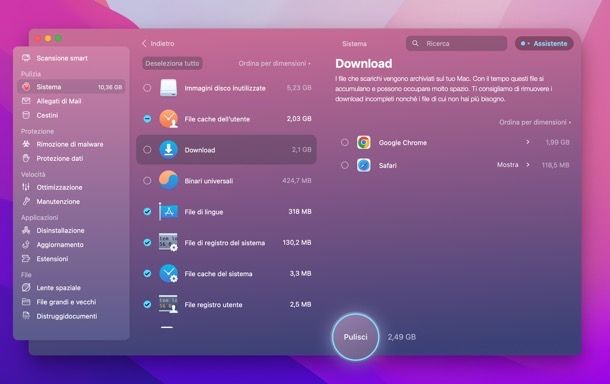Una volta effettuata la selezione degli elementi da cancellare dal computer, clicca sul pulsante Pulisci (collocato in basso) per procedere e liberare spazio sul disco.