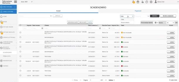 Tra le funzionalità più utili del Modulo Incassi e pagamenti della Fatturazione Elettronica Aruba c’è sicuramente lo scadenzario: una sezione mediante la quale si può tenere sotto controllo tutti gli incassi ricevuti/da ricevere e i pagamenti effettuati/da effettuare, con inoltre la possibilità di registrare pagamenti, incassi, esportare liste di movimenti e altro ancora.