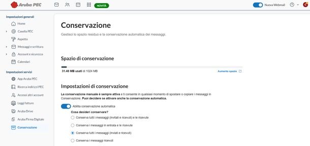 Completato l’acquisto, accedi alla tua Webmail Aruba PEC (usa la Nuova Webmail attivando la relativa levetta in alto a destra), entra nella scheda Impostazioni (che trovi cliccando sulla tua immagine profilo in alto a destra), dunque vai su Conservazione e attiva la levetta relativa al servizio.