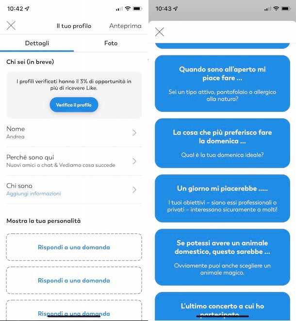 Nella schermata Il tuo profilo, puoi modificare le informazioni che hai fornito in fase di registrazione selezionando le opzioni Nome e Perché sono qui, mentre premendo sulla voce Chi sono puoi aggiungere una tua descrizione. Nella sezione Mostra la tua personalità, invece, puoi selezionare delle domande e inserire la tua risposta, in modo da fornire ulteriori informazioni su di te.