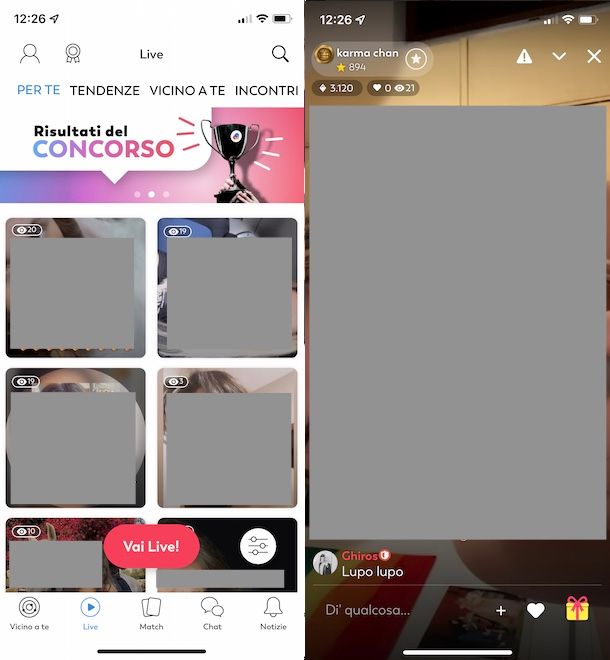 Per visualizzare le live disponibili e accedere a quelle di tuo interesse, premi sulla voce Live collocata nel menu in basso e, tramite le opzioni disponibili in alto (Per te, Tendenze, Vicino a te, Incontri ecc.), filtra le dirette per tipologia.
