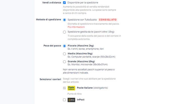 Quando pubblichi un’inserzione su Subito, potrai scegliere di utilizzare TuttoSubito come metodo di spedizione per pacchi che non superano i 15 chili di peso. In questo caso, dovrai solamente selezionare la dimensione del pacco e al resto ci penserà la piattaforma. Una volta venduto l’oggetto, dopo che l’acquirente effettua il pagamento, ti verrà inviata una e-mail con le istruzioni per la spedizione. Dovrai solo preparare il pacco, controllando accuratamente che la misura e il peso corrispondano a quanto indicato in fase di creazione dell’inserzione, stampare l’etichetta, applicarla sul pacco e portarla presso un punto di ritiro o un locker abilitato, senza pagare nulla. Con questa opzione, infatti, le spese di spedizione sono a carico dell’acquirente e tu non dovrai anticiparle.