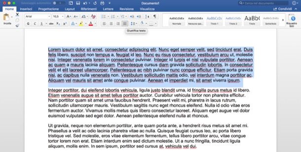 Se preferisci giustificare il testo utilizzando le scorciatoie da tastiera, dopo aver selezionato la parte del documento che ti interessa formattare, premi contemporaneamente i tasti cmd+option+|.