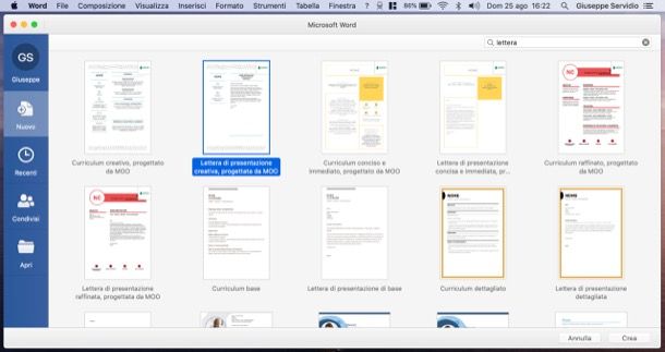 Per procedere, avvia dunque Word sul tuo computer e, nella finestra principale del programma, clicca sul pulsante Nuovo, presente nella barra laterale di sinistra, digita il termine “lettera” nel campo di ricerca collocato in alto e premi Invio sulla tastiera: così visualizzerai tutti i modelli di lettera disponibili. Ti segnalo, inoltre, la possibilità di scaricare altri modelli di lettera direttamente da questa pagina del sito di Microsoft.