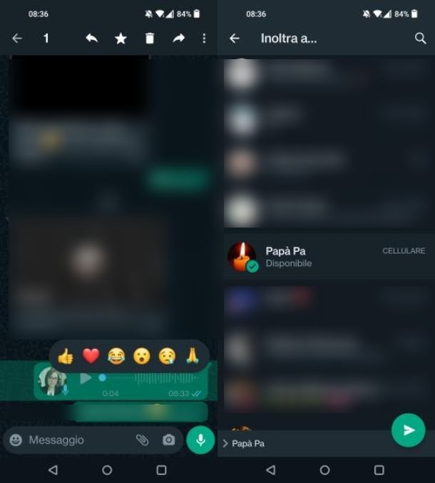 A questo punto, nel menu visualizzato, scegli il contatto al quale inoltrare il messaggio vocale, pigia sull’icona dell’aeroplano in basso a destra e il gioco è fatto.