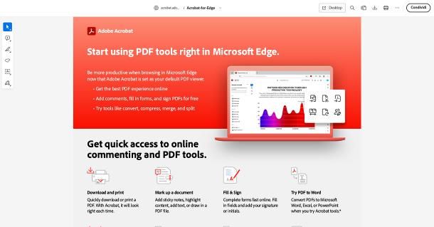 Se impieghi il browser Microsoft Edge, ho buone notizie per te: sullo store dei componenti aggiuntivi del browser, è disponibile l’estensione ufficiale Adobe Acrobat, che consente di aprire i file PDF con un’interfaccia pressoché identica a quella di Adobe Acrobat Reader, direttamente in una scheda/finestra del browser.