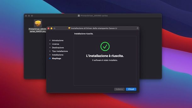 Aperto quest'ultimo, ti basta fare clic sull'icona PrinterDriver_[versione].pkg, premendo poi in successione sui tasti Continua per due volte consecutive, quindi su Accetta e Installa. Ti verrà in seguito richiesto di inserire la password locale, nonché di fare clic sui pulsanti Installa software e Chiudi per concludere la procedura.