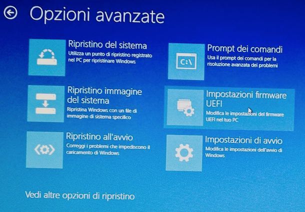 - Se stai usando un netbook con Windows 10, clicca sul pulsante Start (quello con la bandierina di Windows che si trova sulla taskbar) e pigia sull’icona dell’ingranaggio nel menu che si apre. Nella finestra che compare sul desktop, seleziona la voce Aggiornamento e sicurezza, poi quella Ripristino dalla barra laterale di sinistra e fai clic sul pulsante Riavvia ora posto sotto la voce Avvio avanzato. Successivamente, recati in Risoluzione dei problemi > Opzioni avanzate > Impostazioni firmware UEFI, premi il pulsante Riavvia e attendi che il computer venga riavviato.
