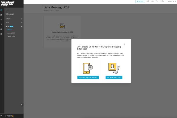 Per creare un messaggio RCS dalla schermata principale di MailUp, fai clic sulla voce Messaggi e poi su RCS. Adesso, fai clic sulla voce Elenco e clicca sul riquadro Crea un nuovo messaggio RCS. Dal pop-up che compare a schermo, procedi alla creazione di un mittente SMS per i messaggi di fallback, dato che al momento gli RCS sono abilitati solo su Android, dunque gli utenti Apple riceveranno un SMS di fallback: per procedere, scegli tra le opzioni Crea mittente numerico o Richiedi Alias SMS (consigliato), in base alle tue necessità.