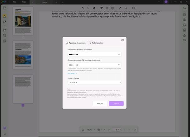 Vuoi proteggere i tuoi PDF contro accessi non autorizzare oppure vuoi impedirne la modifica e/o la stampa? No problem: UPDF consente di cifrare i PDF bloccando sia l'apertura che la modifica/stampa dei documenti con una password.